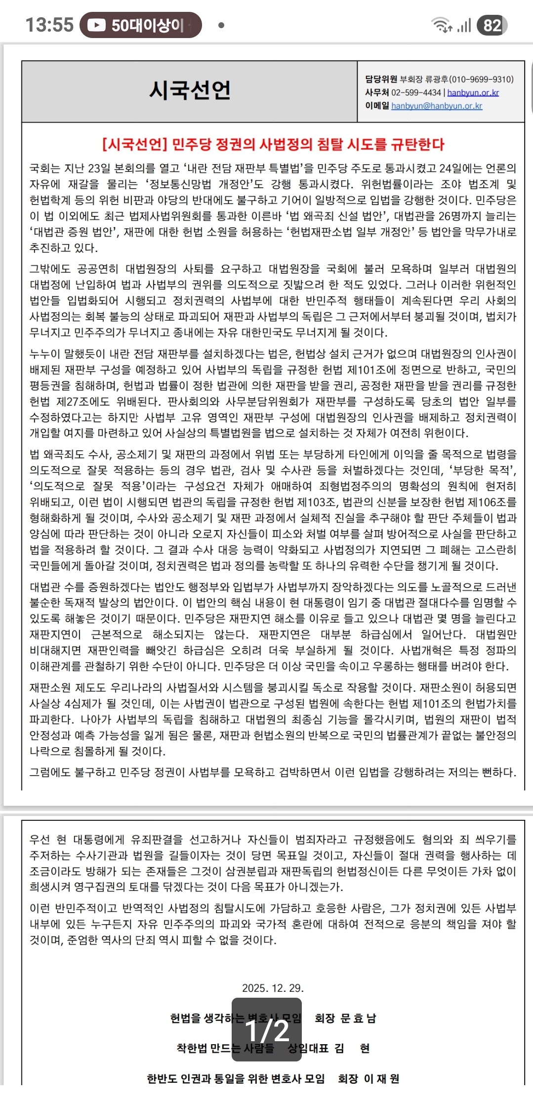 국회는 지난 23일 본회의를 열고 ‘내란 전담 재판부 특별법’을 민주당 주도로 통과시켰고 24일에는 언론의 자유에 재갈을 물리는 ‘정보통신망법 개정안’도 강행 통과시켰다. 위헌법률이라는 조야 법조계 및 헌법학계 등의 위헌 비판과 야당의 반대에도 불구하고 기어이 일방적으로 입법을 강행한 것이다. 민주당은 이 법 이외에도 최근 법제사법위원회를 통과한 이른바 ‘법 왜곡죄 신설 법안’, 대법관을 26명까지 늘리는 ‘대법관 증원 법안’, 재판에 대한 헌법 소원을 허용하는 ‘헌법재판소법 일부 개정안’ 등 법안을 막무가내로 추진하고 있다.