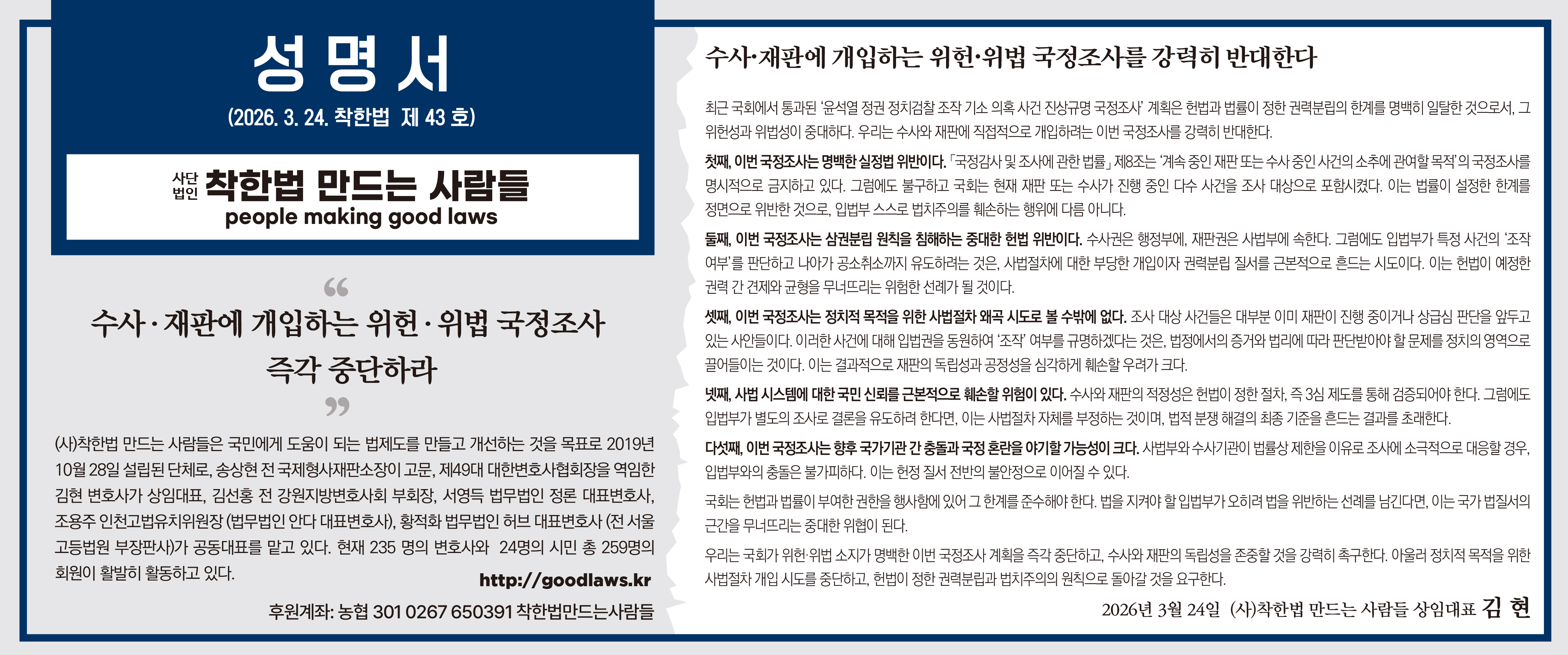 우리는 국회가 위헌·위법 소지가 명백한 이번 국정조사 계획을 즉각 중단하고, 수사와 재판의 독립성을 존중할 것을 강력히 촉구한다. 아울러 정치적 목적을 위한 사법절차 개입 시도를 중단하고, 헌법이 정한 권력분립과 법치주의의 원칙으로 돌아갈 것을 요구한다.