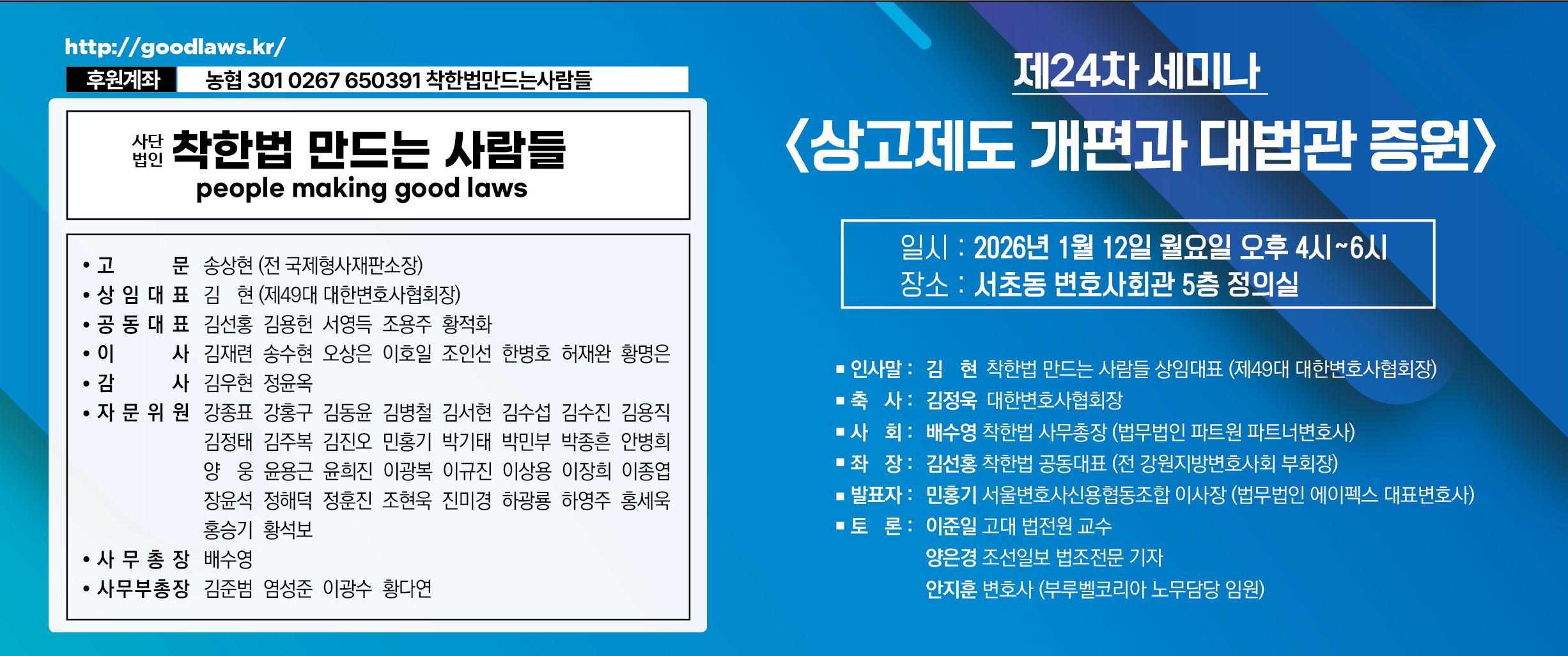 착한법 제24차 세미나 <상고제도 개편과 대법관 증원> 개최- 일시 : 2026. 1. 12. 월요일 오후 4시-6시- 장소 : 서초동 변호사회관 5층 정의실- 인사말 : 김 현 착한법 상임대표 (제49대 대한변호사협회장)- 축 사 : ...